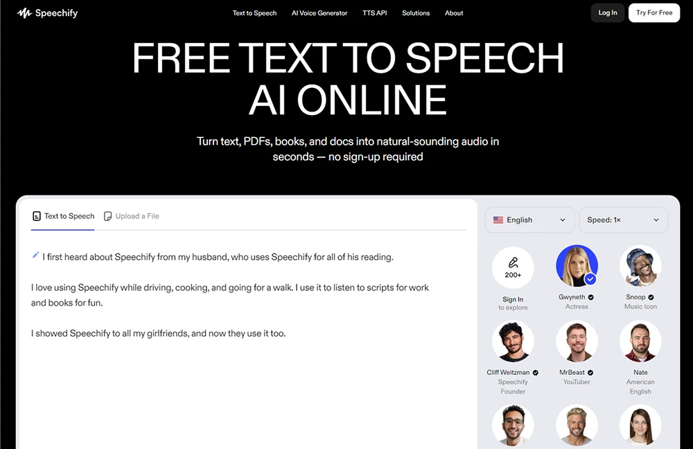 Speechify ofrece narraciones realistas en más de 60 idiomas y con más de 1.000 voces disponibles. Se utiliza mucho para videos de ventas, anuncios, entrenamientos, pódcast e incluso audiolibros, siendo una solución práctica tanto para creadores individuales como para empresas.