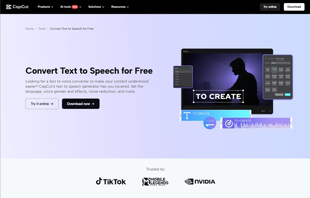 CapCut es un editor de video completo que incorporó funcionalidades de texto a voz directamente en la plataforma. Con él, puedes convertir textos en narraciones, ajustar parámetros como velocidad y tono, y aplicar efectos sonoros sin salir del editor.